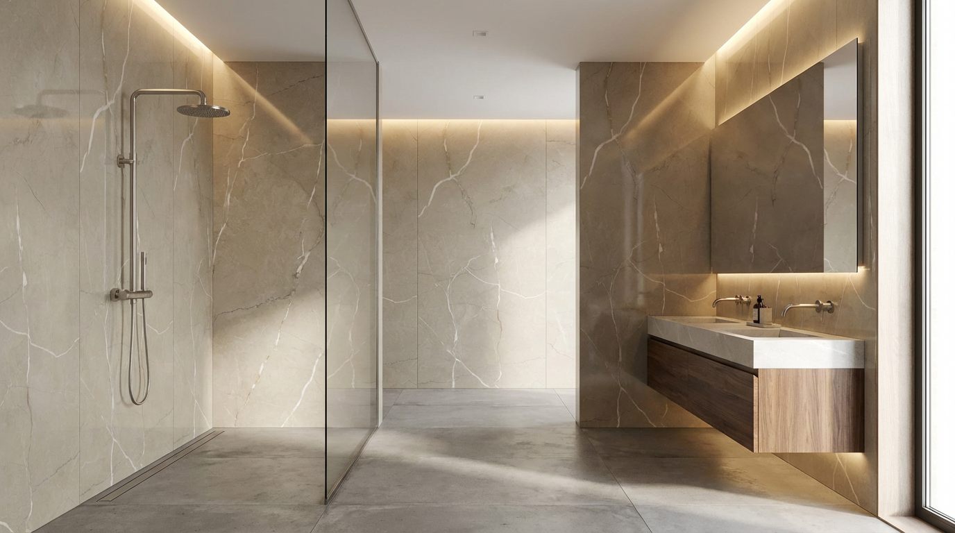 Die Wahl des richtigen Materials ist entscheidend für ein langlebiges und schönes Ergebnis. Wir setzen auf hochwertige SPC-Wandpaneele (Stone Powder Composite), da sie die besten Eigenschaften für den Einsatz im Bad vereinen. Sie sind die perfekte Lösung für jede Wandverkleidung in der Dusche und im gesamten Badezimmer.