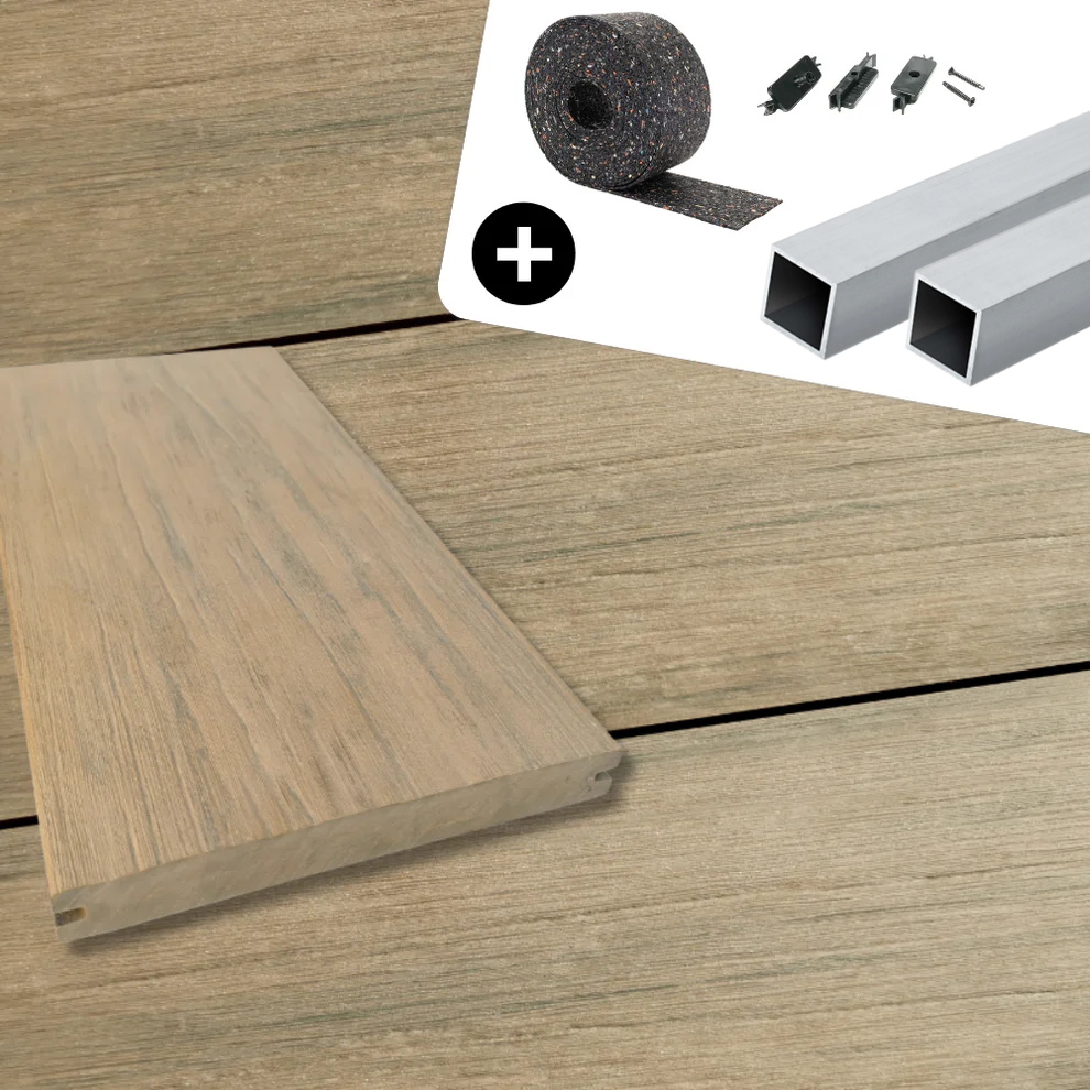 Das Rundum-Sorglos-Paket für deinen Terrassenbau: Pflegeleichtes und langlebiges WPC-Komplettset Muskat Antik Massivdiele
